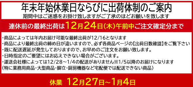●出荷に遅延が発生する場合や厨房機器・受注生産商品につきましてはメールもしくはお電話にて納期のご連絡をいたします。